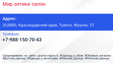 Мир оптики, салон по адресу 352800, Краснодарский край, Туапсе, Фрунзе, 57 в дальнейшем Организация, размещена в следующих категориях: