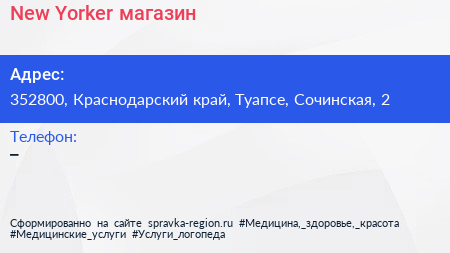 New Yorker, магазин по адресу 352800, Краснодарский край, Туапсе, Сочинская, 2 в дальнейшем Организация, размещена в следующих категориях: