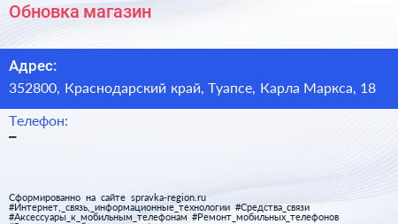 Обновка, магазин по адресу 352800, Краснодарский край, Туапсе, Карла Маркса, 18 в дальнейшем Организация, размещена в следующих категориях: