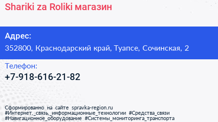 Shariki za Roliki, магазин по адресу 352800, Краснодарский край, Туапсе, Сочинская, 2 в дальнейшем Организация, размещена в следующих категориях: