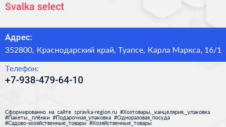 Svalka select по адресу 352800, Краснодарский край, Туапсе, Карла Маркса, 16/1 в дальнейшем Организация, размещена в следующих категориях: