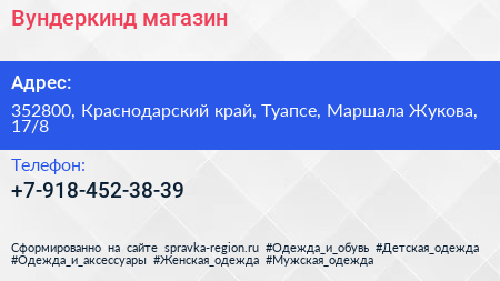 Вундеркинд, магазин по адресу 352800, Краснодарский край, Туапсе, Маршала Жукова, 17/8 в дальнейшем Организация, размещена в следующих категориях: