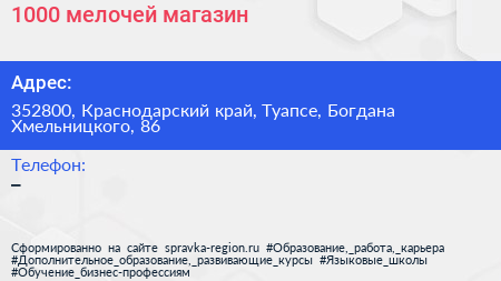 1000 мелочей, магазин по адресу 352800, Краснодарский край, Туапсе, Богдана Хмельницкого, 86 в дальнейшем Организация, размещена в следующих категориях: