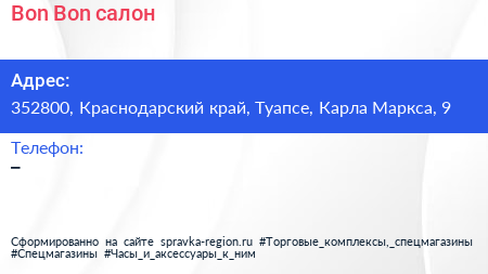 Bon-Bon, салон по адресу 352800, Краснодарский край, Туапсе, Карла Маркса, 9 в дальнейшем Организация, размещена в следующих категориях: