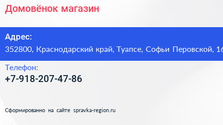 Домовёнок, магазин по адресу 352800, Краснодарский край, Туапсе, Софьи Перовской, 16 в дальнейшем Организация, размещена в следующих категориях: