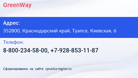 GreenWay по адресу 352800, Краснодарский край, Туапсе, Киевская, 6 в дальнейшем Организация, размещена в следующих категориях: