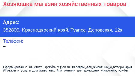 Хозяюшка, магазин хозяйственных товаров по адресу 352800, Краснодарский край, Туапсе, Деповская, 12а в дальнейшем Организация, размещена в следующих категориях:
