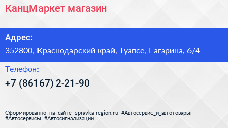 КанцМаркет, магазин по адресу 352800, Краснодарский край, Туапсе, Гагарина, 6/4 в дальнейшем Организация, размещена в следующих категориях: