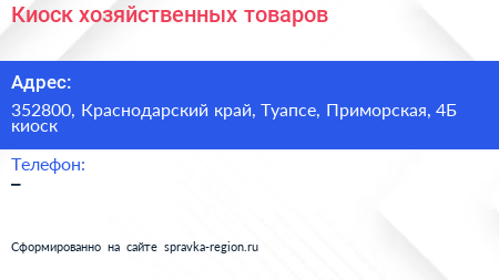 Киоск хозяйственных товаров по адресу 352800, Краснодарский край, Туапсе, Приморская, 4Б киоск в дальнейшем Организация, размещена в следующих категориях: