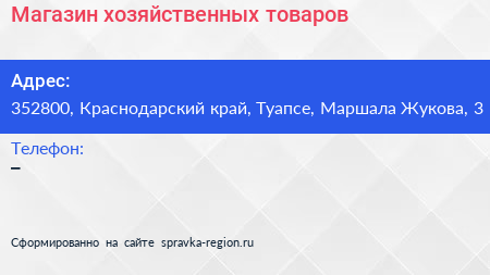 Магазин хозяйственных товаров по адресу 352800, Краснодарский край, Туапсе, Маршала Жукова, 3 в дальнейшем Организация, размещена в следующих категориях: