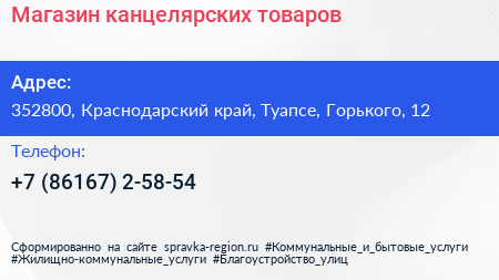 Магазин канцелярских товаров по адресу 352800, Краснодарский край, Туапсе, Горького, 12 в дальнейшем Организация, размещена в следующих категориях: