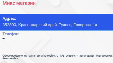 Микс, магазин по адресу 352800, Краснодарский край, Туапсе, Говорова, 1а в дальнейшем Организация, размещена в следующих категориях: