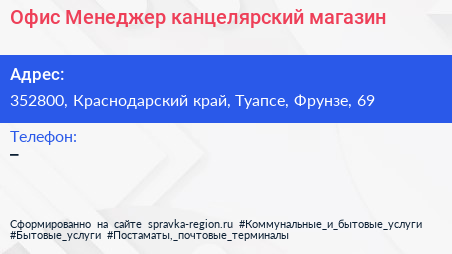 Офис Менеджер, канцелярский магазин по адресу 352800, Краснодарский край, Туапсе, Фрунзе, 69 в дальнейшем Организация, размещена в следующих категориях: