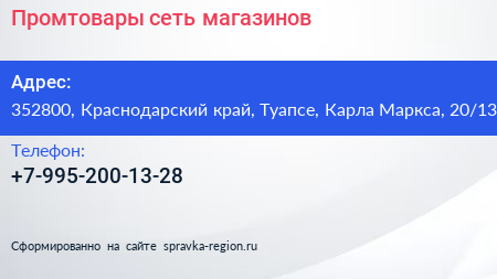 Промтовары, сеть магазинов по адресу 352800, Краснодарский край, Туапсе, Карла Маркса, 20/13 в дальнейшем Организация, размещена в следующих категориях:
