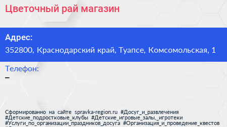Цветочный рай, магазин по адресу 352800, Краснодарский край, Туапсе, Комсомольская, 1 в дальнейшем Организация, размещена в следующих категориях: