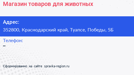 Магазин товаров для животных по адресу 352800, Краснодарский край, Туапсе, Победы, 5Б в дальнейшем Организация, размещена в следующих категориях: