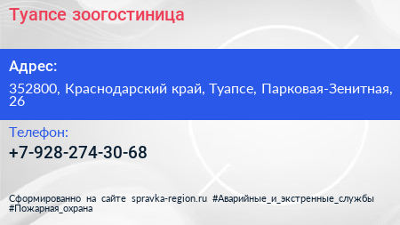 Туапсе, зоогостиница по адресу 352800, Краснодарский край, Туапсе, Парковая-Зенитная, 26 в дальнейшем Организация, размещена в следующих категориях: