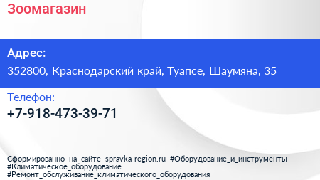 Зоомагазин по адресу 352800, Краснодарский край, Туапсе, Шаумяна, 35 в дальнейшем Организация, размещена в следующих категориях: