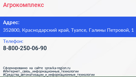 Агрокомплекс по адресу 352800, Краснодарский край, Туапсе, Галины Петровой, 1 в дальнейшем Организация, размещена в следующих категориях: