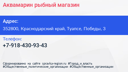 Аквамарин, рыбный магазин по адресу 352800, Краснодарский край, Туапсе, Победы, 3 в дальнейшем Организация, размещена в следующих категориях: