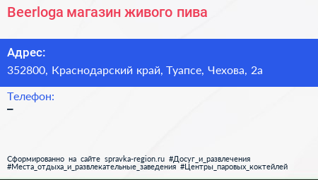Beerloga, магазин живого пива по адресу 352800, Краснодарский край, Туапсе, Чехова, 2а в дальнейшем Организация, размещена в следующих категориях: