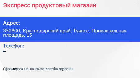 Экспресс, продуктовый магазин по адресу 352800, Краснодарский край, Туапсе, Привокзальная площадь, 15 в дальнейшем Организация, размещена в следующих категориях: