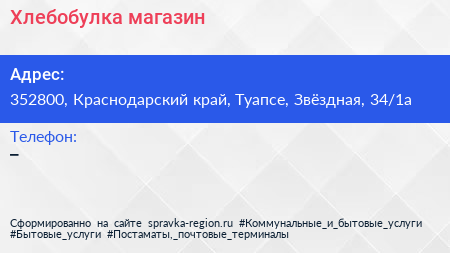 Хлебобулка, магазин по адресу 352800, Краснодарский край, Туапсе, Звёздная, 34/1а в дальнейшем Организация, размещена в следующих категориях: