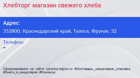 Хлебторг, магазин свежего хлеба по адресу 352800, Краснодарский край, Туапсе, Фрунзе, 32 в дальнейшем Организация, размещена в следующих категориях: