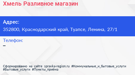 Хмель Разливное, магазин по адресу 352800, Краснодарский край, Туапсе, Ленина, 27/1 в дальнейшем Организация, размещена в следующих категориях: