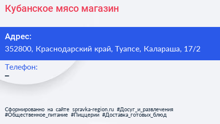 Кубанское мясо, магазин по адресу 352800, Краснодарский край, Туапсе, Калараша, 17/2 в дальнейшем Организация, размещена в следующих категориях: