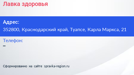 Лавка здоровья по адресу 352800, Краснодарский край, Туапсе, Карла Маркса, 21 в дальнейшем Организация, размещена в следующих категориях: