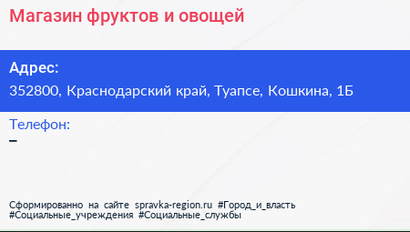 Магазин фруктов и овощей по адресу 352800, Краснодарский край, Туапсе, Кошкина, 1Б в дальнейшем Организация, размещена в следующих категориях: