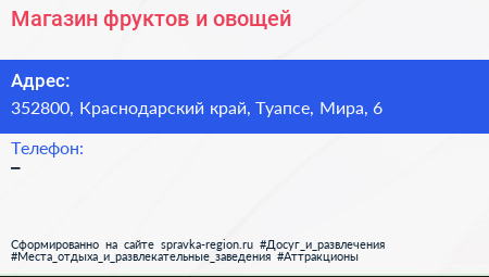 Магазин фруктов и овощей по адресу 352800, Краснодарский край, Туапсе, Мира, 6 в дальнейшем Организация, размещена в следующих категориях:
