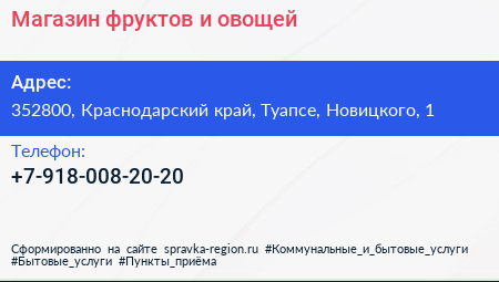 Магазин фруктов и овощей по адресу 352800, Краснодарский край, Туапсе, Новицкого, 1 в дальнейшем Организация, размещена в следующих категориях: