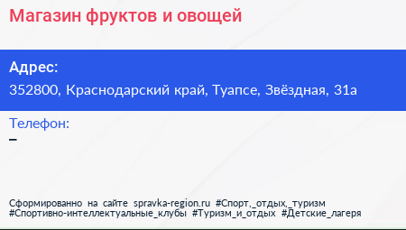 Магазин фруктов и овощей по адресу 352800, Краснодарский край, Туапсе, Звёздная, 31а в дальнейшем Организация, размещена в следующих категориях: