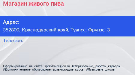 Магазин живого пива по адресу 352800, Краснодарский край, Туапсе, Фрунзе, 3 в дальнейшем Организация, размещена в следующих категориях: