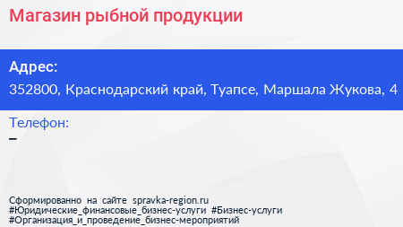 Магазин рыбной продукции по адресу 352800, Краснодарский край, Туапсе, Маршала Жукова, 4 в дальнейшем Организация, размещена в следующих категориях: