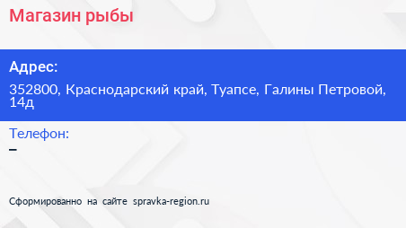 Магазин рыбы по адресу 352800, Краснодарский край, Туапсе, Галины Петровой, 14д в дальнейшем Организация, размещена в следующих категориях: