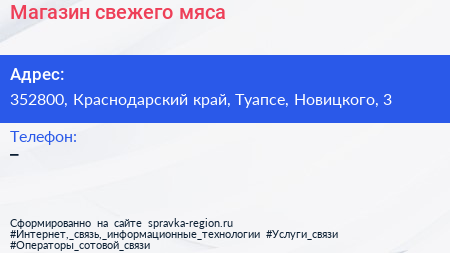 Магазин свежего мяса по адресу 352800, Краснодарский край, Туапсе, Новицкого, 3 в дальнейшем Организация, размещена в следующих категориях: