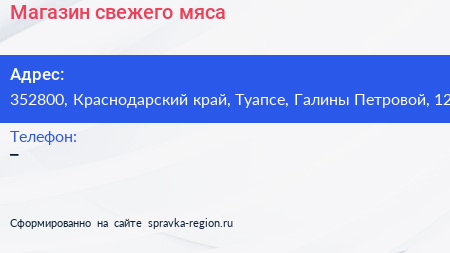 Магазин свежего мяса по адресу 352800, Краснодарский край, Туапсе, Галины Петровой, 12 в дальнейшем Организация, размещена в следующих категориях: