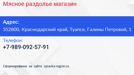 Мясное раздолье, магазин по адресу 352800, Краснодарский край, Туапсе, Галины Петровой, 1 в дальнейшем Организация, размещена в следующих категориях: