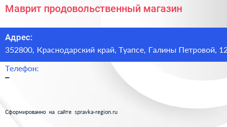 Маврит, продовольственный магазин по адресу 352800, Краснодарский край, Туапсе, Галины Петровой, 12 в дальнейшем Организация, размещена в следующих категориях: