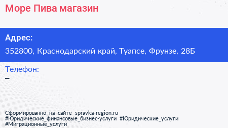 Море Пива, магазин по адресу 352800, Краснодарский край, Туапсе, Фрунзе, 28Б в дальнейшем Организация, размещена в следующих категориях: