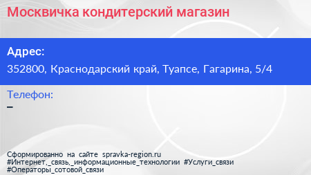 Москвичка, кондитерский магазин по адресу 352800, Краснодарский край, Туапсе, Гагарина, 5/4 в дальнейшем Организация, размещена в следующих категориях: