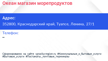 Океан, магазин морепродуктов по адресу 352800, Краснодарский край, Туапсе, Ленина, 27/1 в дальнейшем Организация, размещена в следующих категориях: