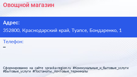 Овощной магазин по адресу 352800, Краснодарский край, Туапсе, Бондаренко, 1 в дальнейшем Организация, размещена в следующих категориях: