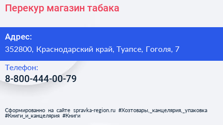 Перекур, магазин табака по адресу 352800, Краснодарский край, Туапсе, Гоголя, 7 в дальнейшем Организация, размещена в следующих категориях: