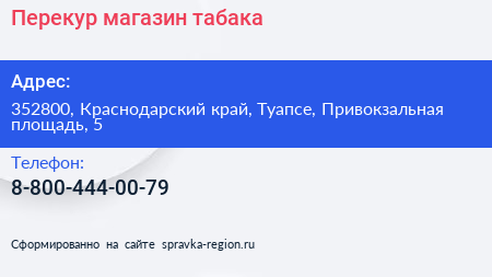Перекур, магазин табака по адресу 352800, Краснодарский край, Туапсе, Привокзальная площадь, 5 в дальнейшем Организация, размещена в следующих категориях: