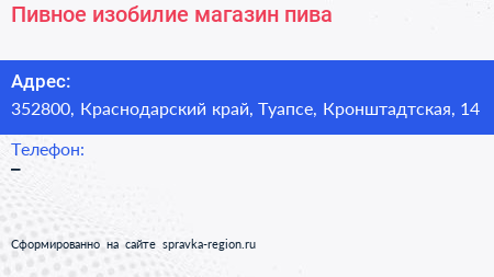Пивное изобилие, магазин пива по адресу 352800, Краснодарский край, Туапсе, Кронштадтская, 14 в дальнейшем Организация, размещена в следующих категориях: