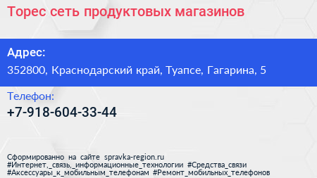 Торес, сеть продуктовых магазинов по адресу 352800, Краснодарский край, Туапсе, Гагарина, 5 в дальнейшем Организация, размещена в следующих категориях: